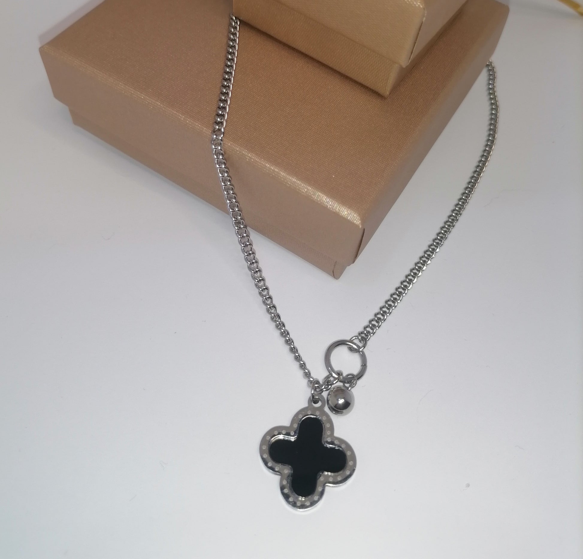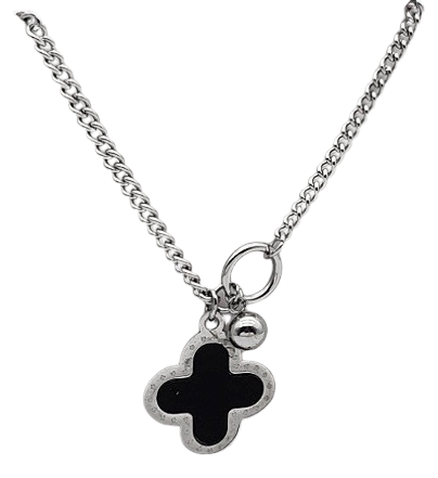 CQ009 | Cadena con dije trébol cuatro hojas en acero inoxidable y esmaltado negro